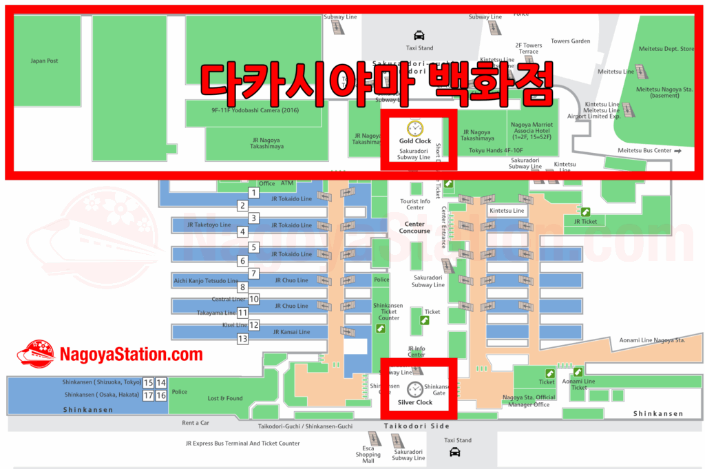지하에서는 구글맵으로 GPS상 위치가 정확히 나타나지 않습니다. 나고야역에서 길을 잃어버렸을 때 자신이 위치한 곳을 아는 방법 중 하나는 금시계와 은시계를 찾는 것입니다. 이 두 개의 시계탑을 이정표로 삼는다면 쉽게 자신의 위치를 파악할 수 있습니다. 금시계가 있는 곳은 나고야 로컬들에게 만남의 장소로 유명합니다. 탁 트인 광장 같은 곳 중심에 노란 시계탑이 덩그러니 있어서 쉽게 찾을 수 있습니다. 그리고 시계탑 정면을 기준으로 양쪽이 모두 다카시야마 백화점이며 식당, 카페들이 입점해 있습니다. JR 나고야 다카시야마 백화점은 일본 전국 매출 4위에 해당하는 매우 거대한 백화점으로서 나고야역 쇼핑의 핵심이 되는 곳입니다. 또한 금시계 정면 기준 왼쪽으로 코인락커, 백화점 내 일정금액 이상 구매 시 짐을 보관해주는 보관소가 있어서 다카시야마 백화점이 목적지라면 금시계를 우선적으로 찾아야 합니다.