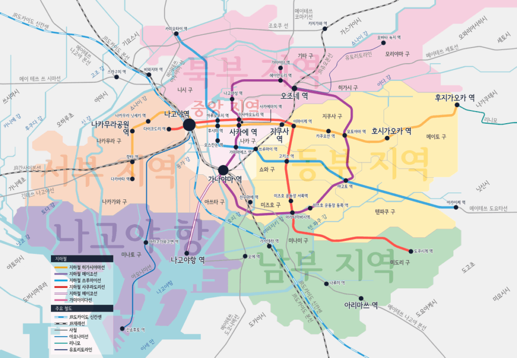 나고야역에서 지하상가 쇼핑을 하거나, 도쿄 또는 오사카(신오사카)로 가는 신칸센을 타기 위해 많은 유동인구가 몰리게 됩니다. 그리고 신칸센을 제외하고도 JR의 도카이도 본선, 츄오 본선, 간사이 본선이 있고 히가시야마선, 사쿠라도리선, 아오나미선, 메이테츠 나고야 본선, 긴테츠 나고야 본선까지 총 9개의 노선이 정차하는 곳입니다. 그런 데다가 나고야는 일본 아이치현, 주부지방의 중심이기 때문에 특히나 많은 사람들이 몰리게 됩니다. 센트레아 공항에서 열차(뮤스카이, 메이테츠 특급 등)을 타고 나고야역에 내려서 캐리어를 들고 사람에 치여서 길을 찾다보면 헤맬 가능성이 높습니다. 나고야역에서 길을 잘 찾는 방법, 나고야의 중심인 사카에로 쉽게 이동하는 방법을 알아보겠습니다.