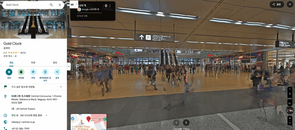 아래 이미지는 금시계를 스트리트 뷰로 보는 것입니다. 평면의 지도를 보는 것과 달리 어떻게 금시계를 찾아갈 수 있을지 더 잘 이해되지 않으시나요? PC 환경에서 마우스 커서를 움직여서 방향을 전환할 수 있고 마우스 클릭으로 내부 곳곳을 살펴볼 수 있습니다. 물론 현재 나고야역의 스트리트 뷰는 2016년으로 상당한 시간이 지났지만 백화점과 신칸센이 교차하는 곳으로 현재도 큰 변화는 없어서 나고야역 내부를 사전조사하는 데 무리가 없습니다.