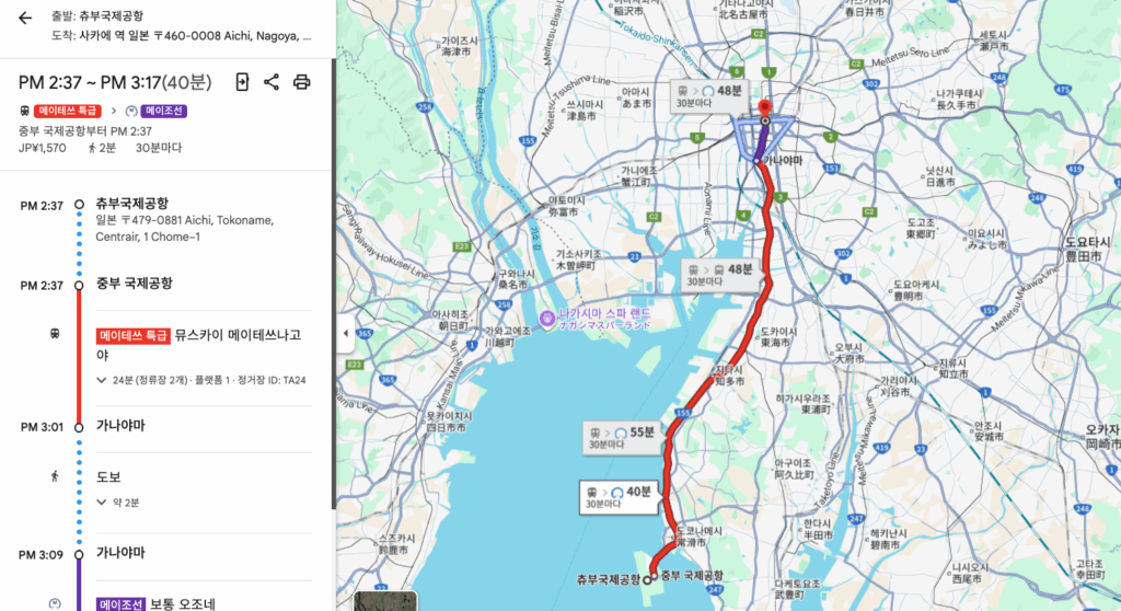 위에 소개한 금시계라는 이정표를 통해 다카시야마 백화점, 신칸센의 위치를 파악하는 데 도움이 될 수 있겠지만 나고야 여행에서 나고야역보다는 사카에, 오스상점가가 목적이라면 굳이 번잡한 나고야역에 내리지 않아도 됩니다. 제가 추천하는 것은 나고야 교통의 거점인 가나야마를 통해 사카에로 이동하는 것입니다. 츄부국제공항에서 나고야역으로 가는 뮤스카이, 메이테츠 특급, 급행 등 모든 열차는 가나야마역에서 정차합니다. 그리고 가나야마역은 나고야역보다 한산하면서 사카에로 이동하는 지하철 메이조선을 타고 8분만에 사카에역으로 이동할 수 있습니다.